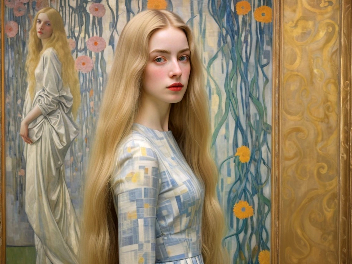 A young woman with long blonde hair, wearing a shimmering silver dress, stands before a painting of a blonde woman in a silver dress with stylized flowers and a golden frame.