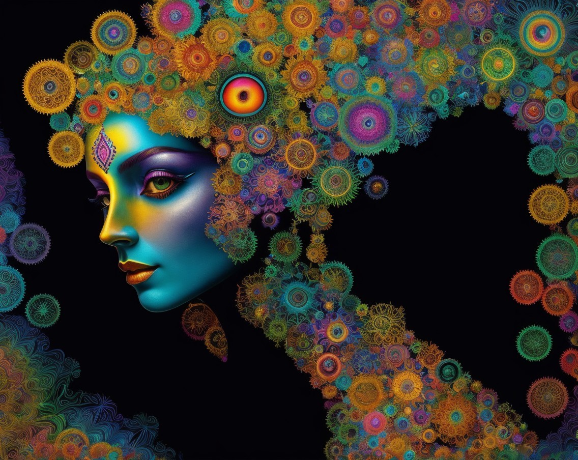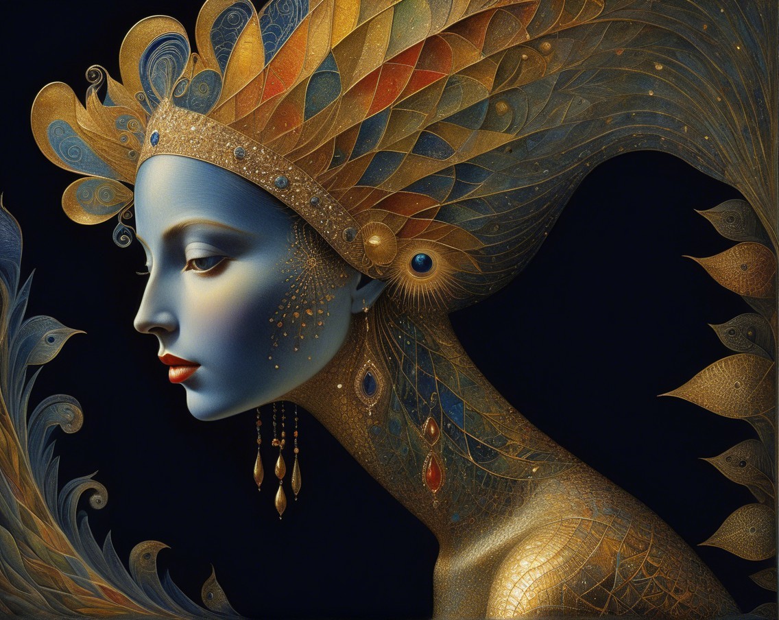 A single image, psychedelic siren, style of Alex Grey, style of Remedios Varo, style of Paul Klee, style of Leonora Carrington, eye contact, soft, beautiful delicate interplay of light and shadows on every surface, exotic, vivid, radiant, kaleidoscopic, highly colorful, most complex and highly intricate, dominant golden and indigo but colors, highly intricate and utterly complex designs and patterns, exciting. Prompt by Vishrut Abhinna.