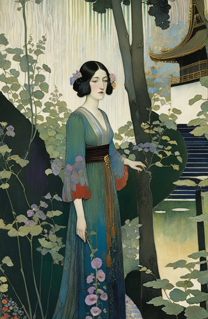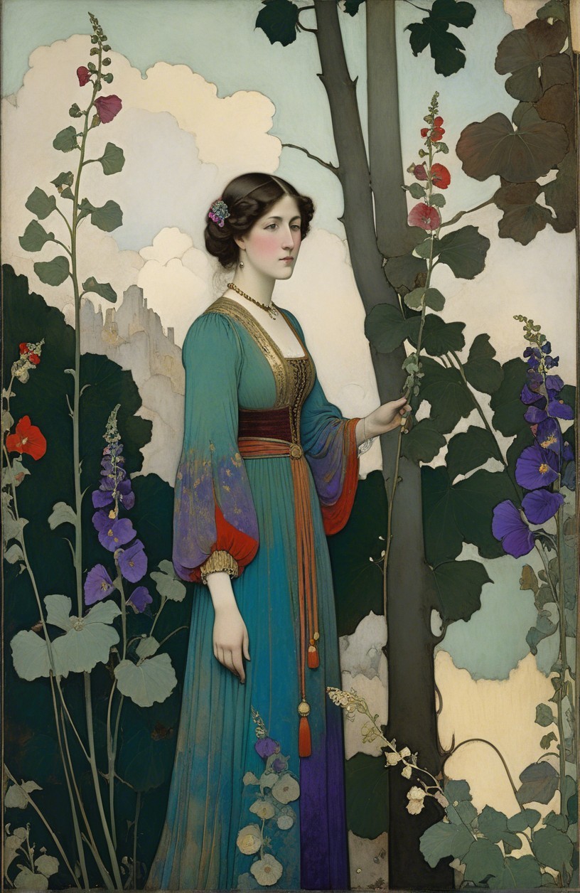 A woman in a flowing teal gown adorned with gold accents stands amidst tall hollyhocks, embodying grace and elegance. Floral accents in her hair complement the vibrant colors of her surroundings.