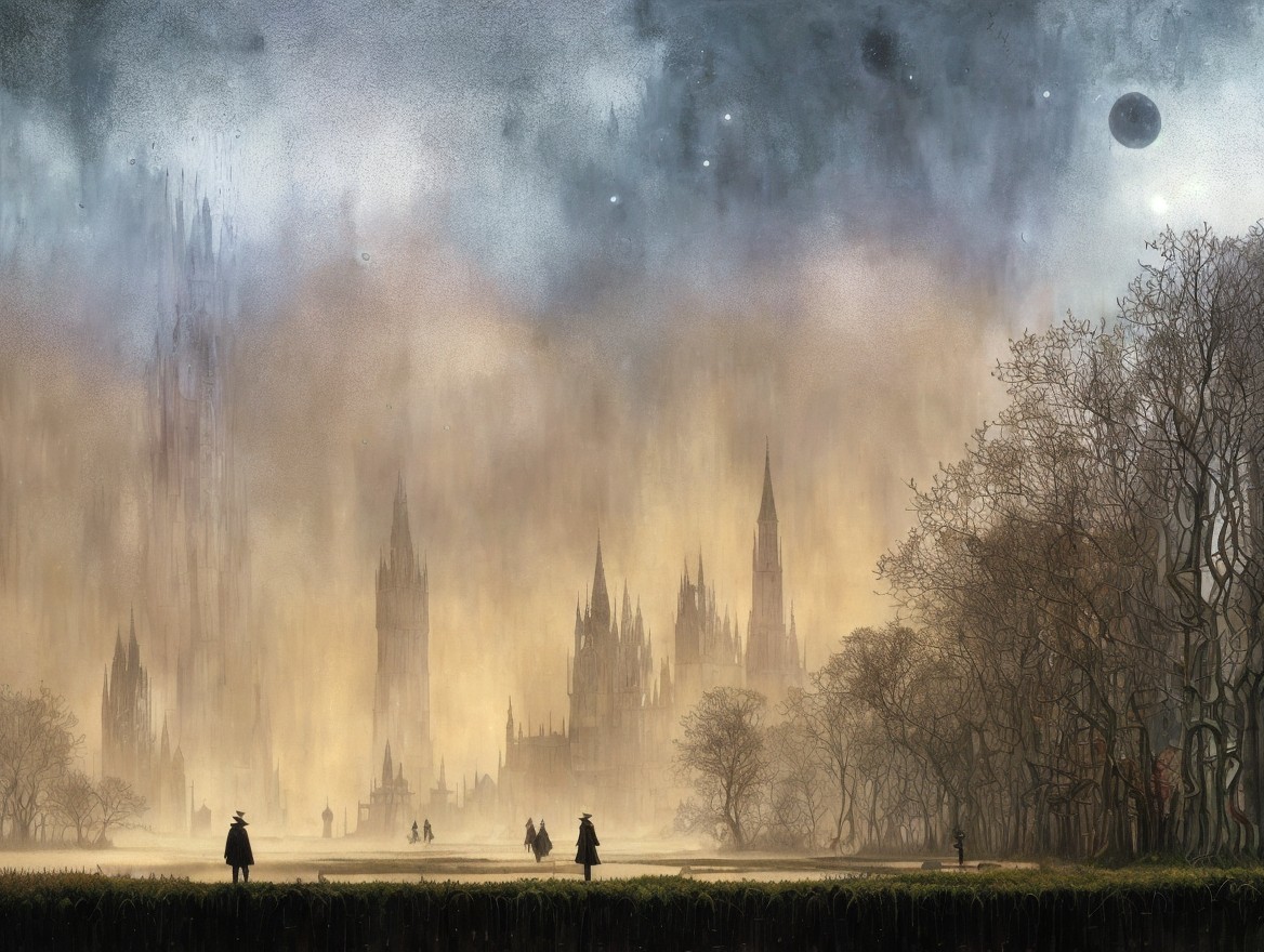 A painting with silhouetted figures, trees, and spired buildings under a sky with streaked pink and gray hues.