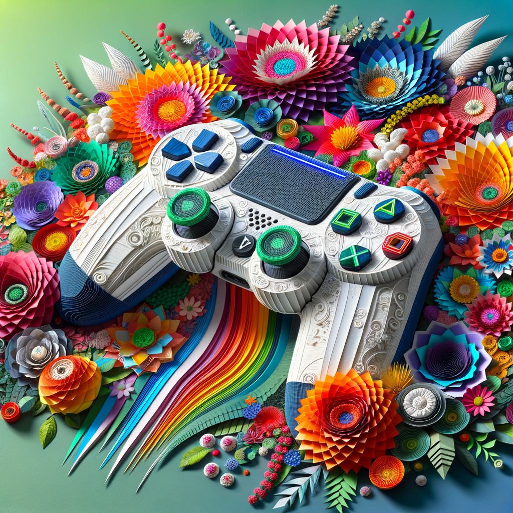 A colorful game controller surrounded by vibrant paper flowers and rainbow trails on a teal background.