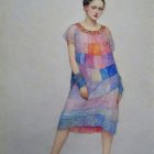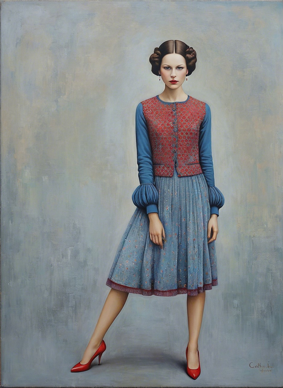 a full female figure, full body, light blue pleated floral skirt, blue shirt with puffy sleeves, red patterned sleeveless vest, red high heels, red lips, red earrings, dark eyes, dark hair in buns, light gray background, standing, a painting, oil on canvas, elegant, detailed,