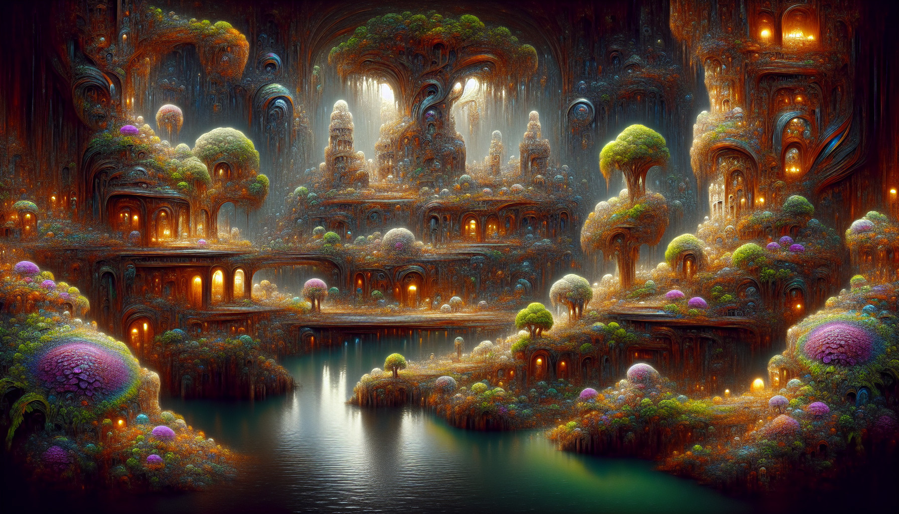 A stunning cosmic landscape featuring a cavern filled with planets, a shimmering lake, and towering rock formations, all set against a backdrop of stars and distant galaxies.