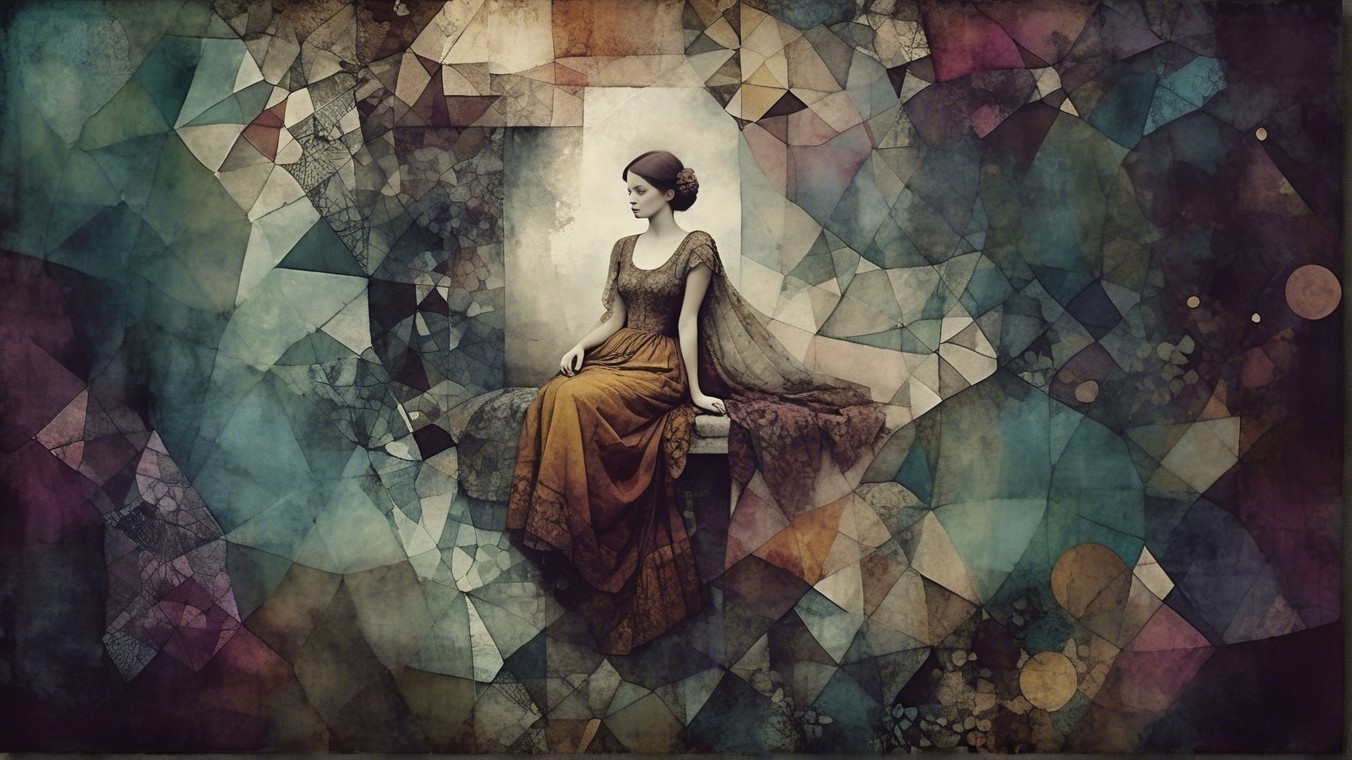 A serene woman in a vintage dress sits thoughtfully against a backdrop of abstract shapes and colors, blending soft hues with geometric patterns to create a dreamlike atmosphere.