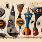 A full shot watercolor painting of five weird whimsical animals standing in a line on a light brown stage-like platform in front of a light brown parchment-like background with small, floating spheres. From left to right: a tall, spotted, brown dog with blue eyes and pointy ears; a small,
