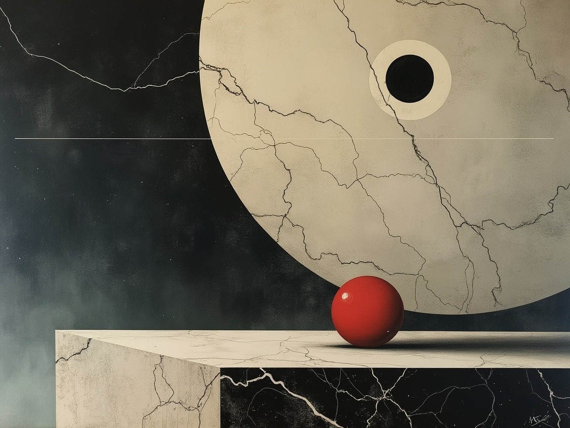 A surreal composition featuring a large celestial body against a dark, starry background. A polished, colorful orb sits atop a marble-like structure, merging cosmic elements with artistic design.