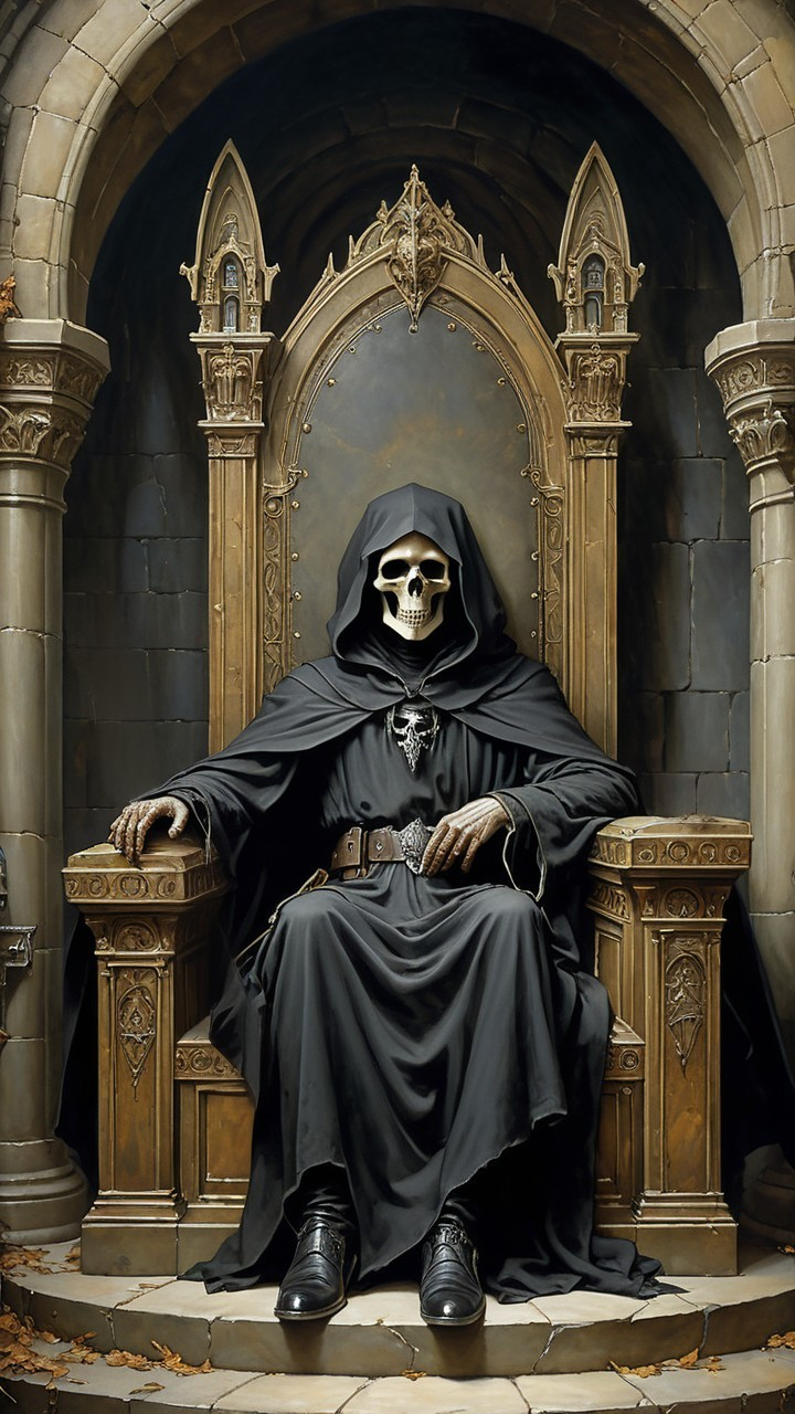 A skeletal figure adorned in dark robes sits majestically on a throne, surrounded by ornate architecture. The eerie presence exudes an air of authority and mystery.