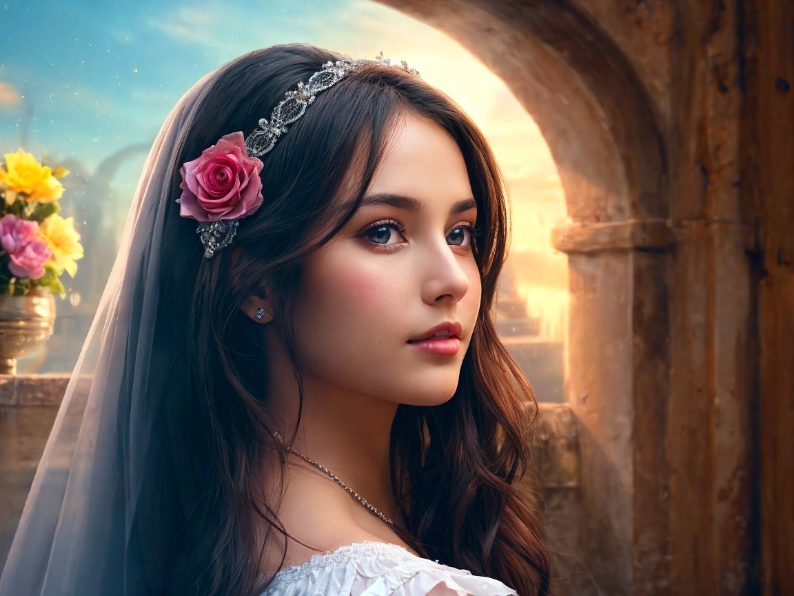 The image features a serene young woman with long black hair adorned with a sparkling hairpiece, set against a cosmic backdrop of moons and stars, exuding an ethereal beauty.