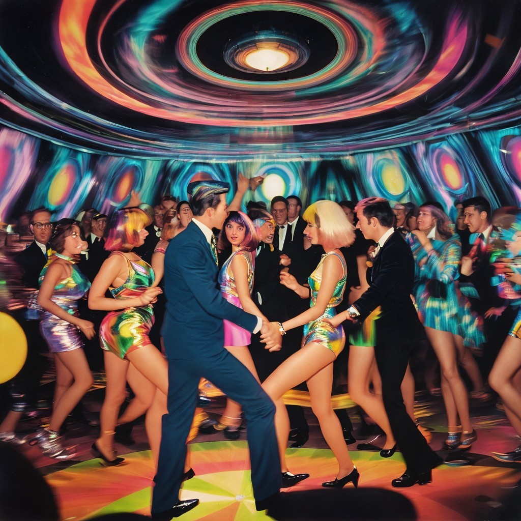 A vibrant 1960s discotheque scene with couples dancing, men in suits, women in shiny dresses, and psychedelic lighting overhead.