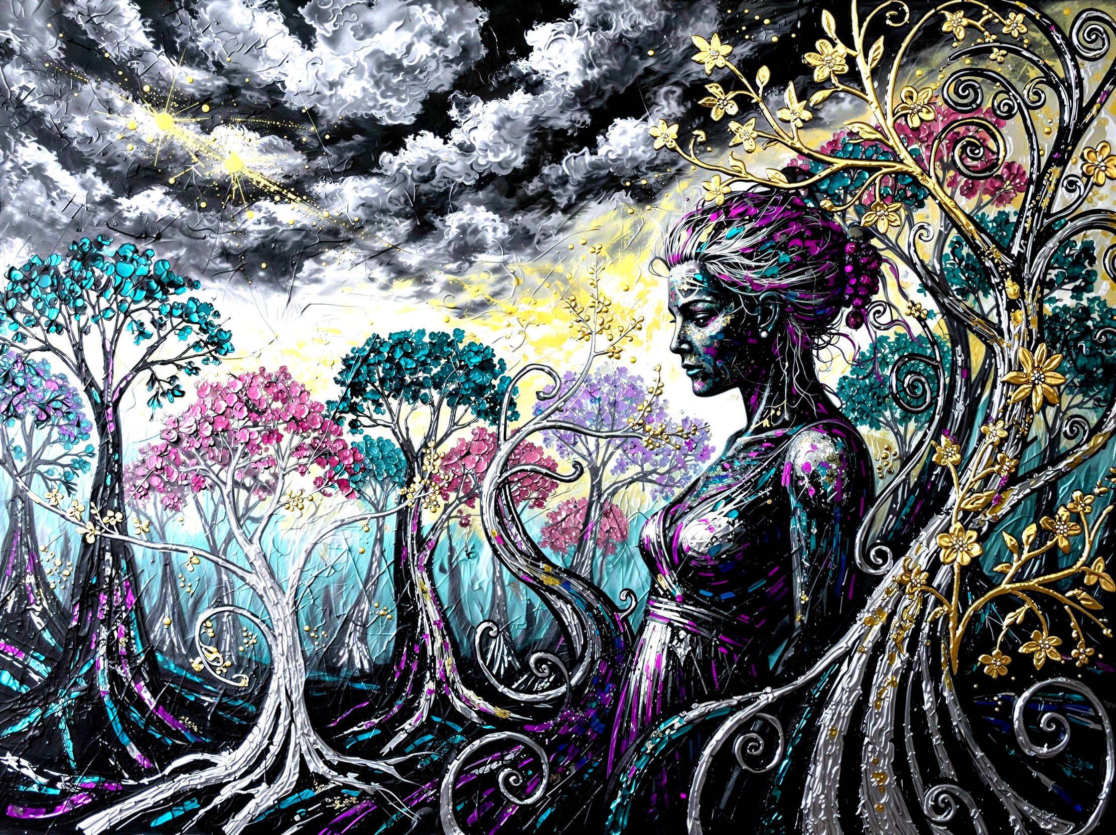 A painting with a textured, impasto style, illustrating a stylized female figure on the right side of the frame, facing left. The woman has dark skin with iridescent flecks of vibrant purple, blue, and pink, resembling the colors of an oil slick or peacock feathers. Her hair is styled in