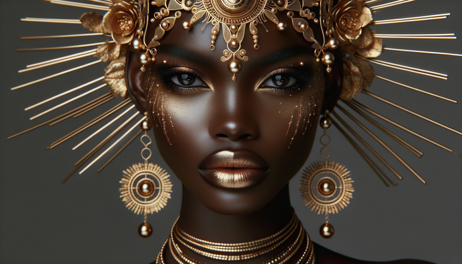 A digital artwork of a woman with elaborate golden headdress, jewelry, and decorative facial markings against a neutral background.