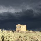 A solitary, ornate building sits atop a rocky hill, surrounded by rugged terrain. Dark clouds loom in the sky, creating a dramatic contrast against the structure's light-colored façade.