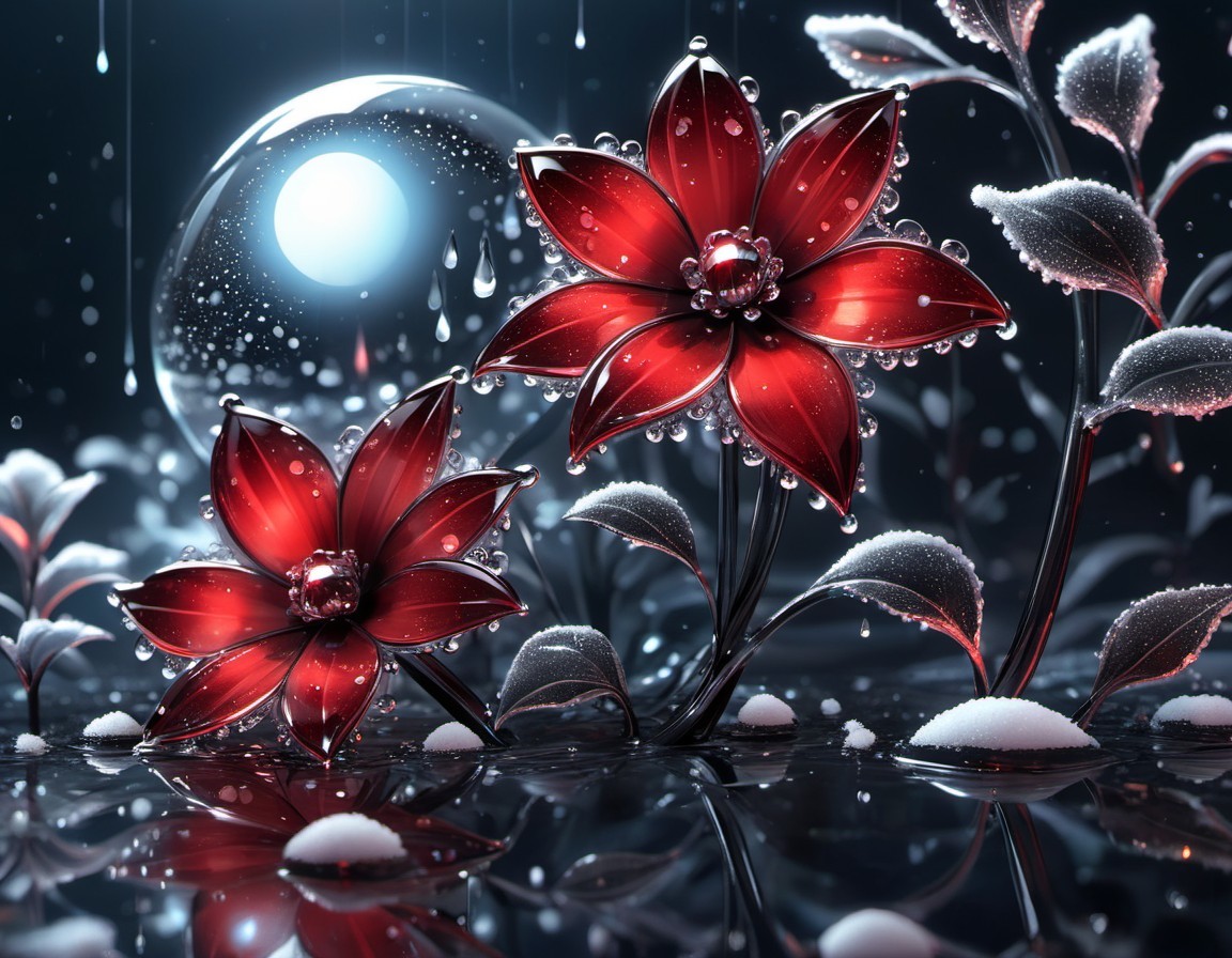 Fantastical red flowers with a glowing center on a reflective surface, surrounded by leaves with snow, under a night sky with a luminous orb.