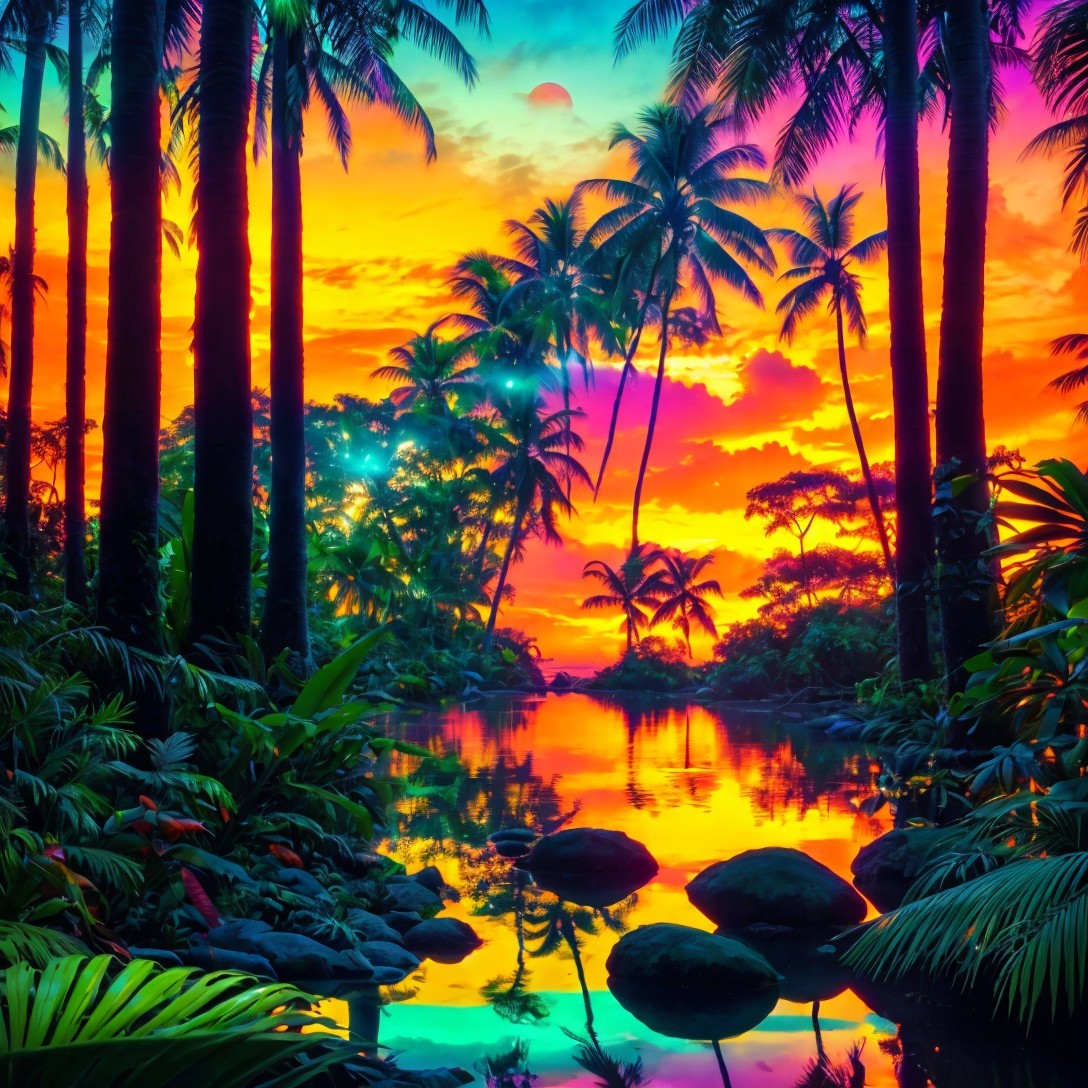 Create a vibrant and surreal tropical rainforest scene set during a vivid sunset. The background should be ablaze with a sky featuring gradients of deep purples, oranges, reds, and yellows, transitioning smoothly into each other above the silhouettes of distant trees. The setting sun should be partially visible as a bright, warm orb dipping low on the horizon, reflecting its colors onto a still, glassy river that flows gently through the forest.