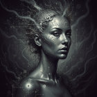 An artistic conception of a woman's face merging with the quantum field which features circuit-like patterns and ethereal smoke, symbolising the fusion of quantum theory, technology, and humanity.