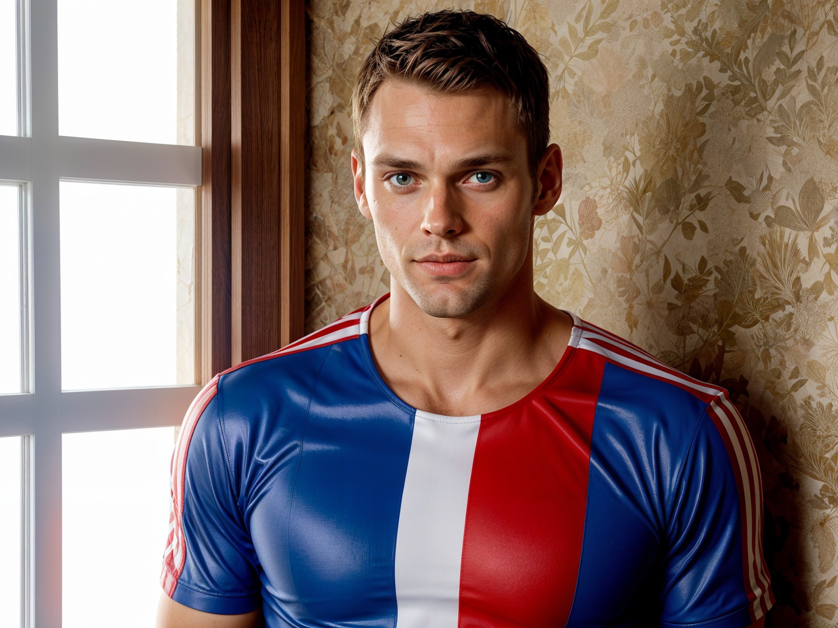 A muscular man stands on a beach, holding Captain America's iconic shield. He’s shirtless, wearing blue swim trunks, and the backdrop features rocky cliffs and a serene ocean.