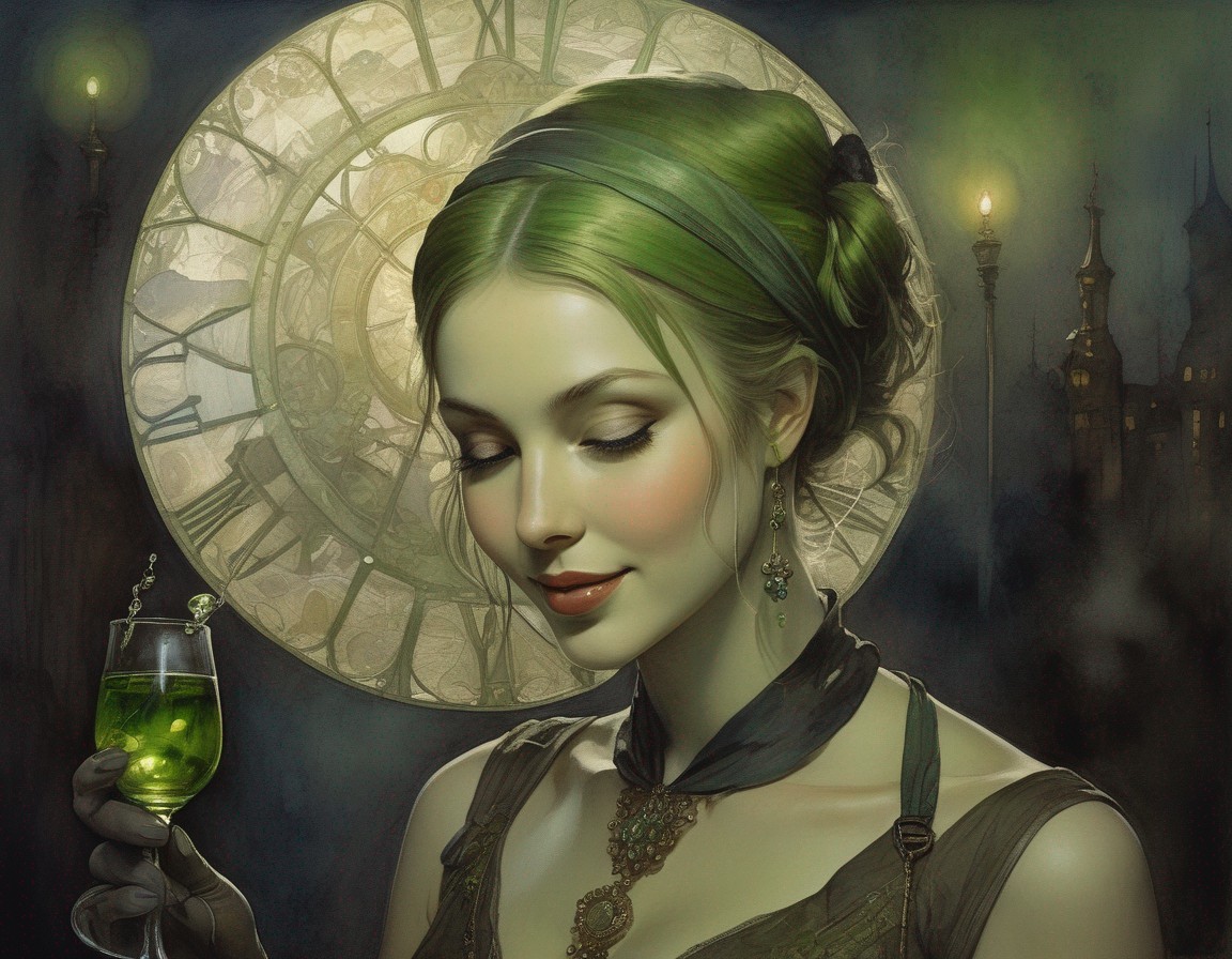 Absinthe haze. Beautiful sensual woman feeling so happy, all joy, fun and happines, having a wonderful time, surrounded by all good and lovely things, love, joy and peace, by Jean-Baptiste Monge, watercolor ink, intricate details, fantasy, beautiful, award winning, fantastic view, crisp quality, Peter Gric, Ivan Shishkin, light reflections, vibrant colours, volumetric lighting, polished, masterful surrealism, high definition, crisp quality