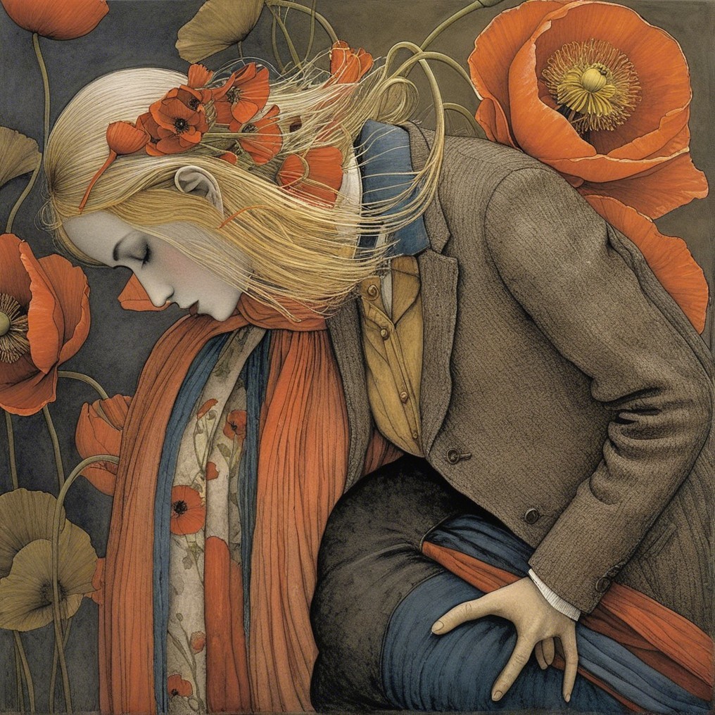 A androgynous figure in a suit bends gracefully among vibrant red poppies, their hair flowing and adorned with blossoms, creating a striking contrast of colors and emotions in a surreal setting.