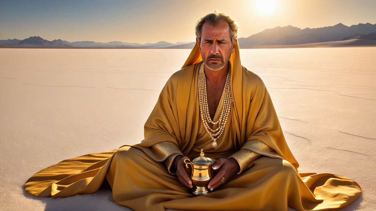 A powerful oil painting portraying a wealthy man lost in a blinding salt desert. Dressed in golden robes and adorned with pearls, he sits solemnly beneath the harsh sun, holding a golden cup that holds no water. The endless white horizon reflects both purity and desolation, symbolizing the emptiness of material riches when faced with the simplest human need—life itself. A haunting reflection on wealth, humility, and the limits of power in the face of nature.