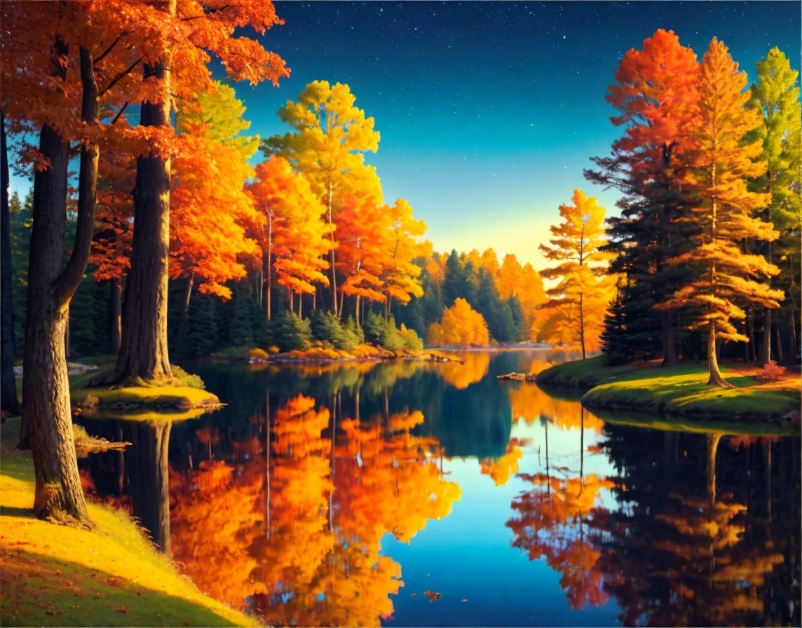 Autumn trees with vibrant foliage reflecting in a calm lake under a starry twilight sky.
