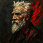 A distinguished elderly man with a white beard and hair gazes thoughtfully to the side. His expressive face is set against a bold, dark background with vibrant red accents.