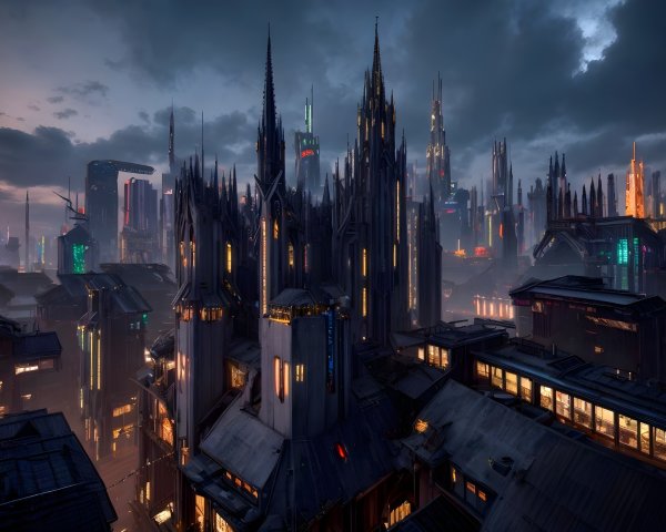 Futuristic buildings with flowing buttresses in a vibrant cityscape at dusk, illuminated with purple and pink lights, admired by onlookers.