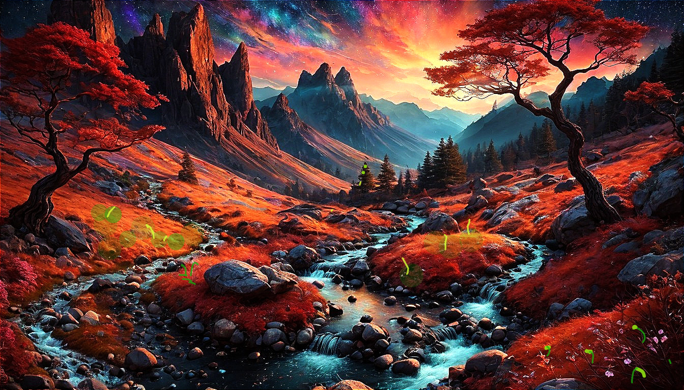 A vibrant landscape featuring jagged mountains under a colorful, starry sky. A gentle stream winds through an autumn-hued valley, with trees and flowers adding bursts of red and orange.