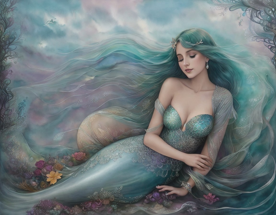 A serene mermaid with a shimmering tail rests underwater amid coral, fish, and a seahorse, basking in the sun's rays filtering down.