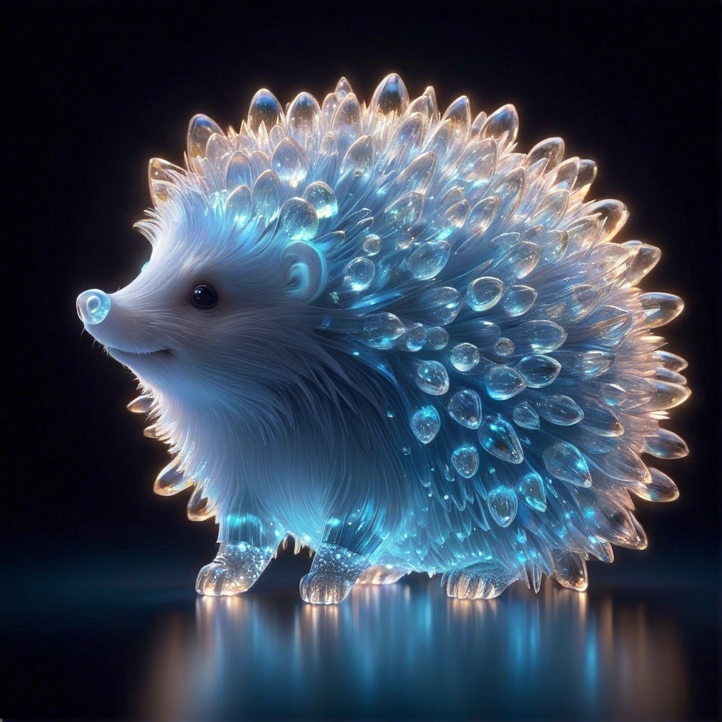 Inspired by a prompt by @LoveCat. A whimsical hedgehog glows with luminous, water droplet-like quills. Its soft body radiates a gentle blue light, creating a magical and enchanting atmosphere in the scene.