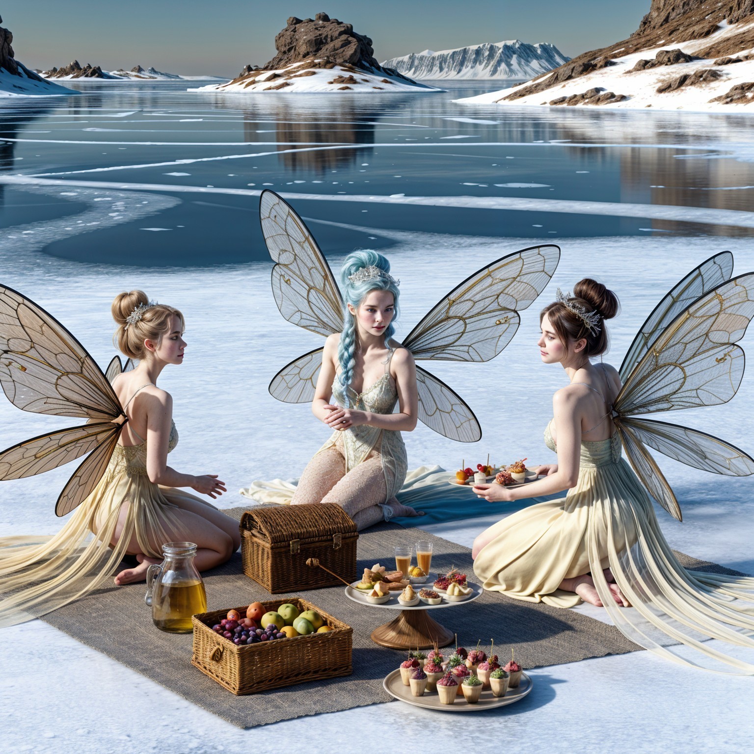 Three enchanting fairies with delicate wings bask on a snowy landscape, surrounded by picnic baskets filled with delicious treats, with a stunning ice castle in the background.
