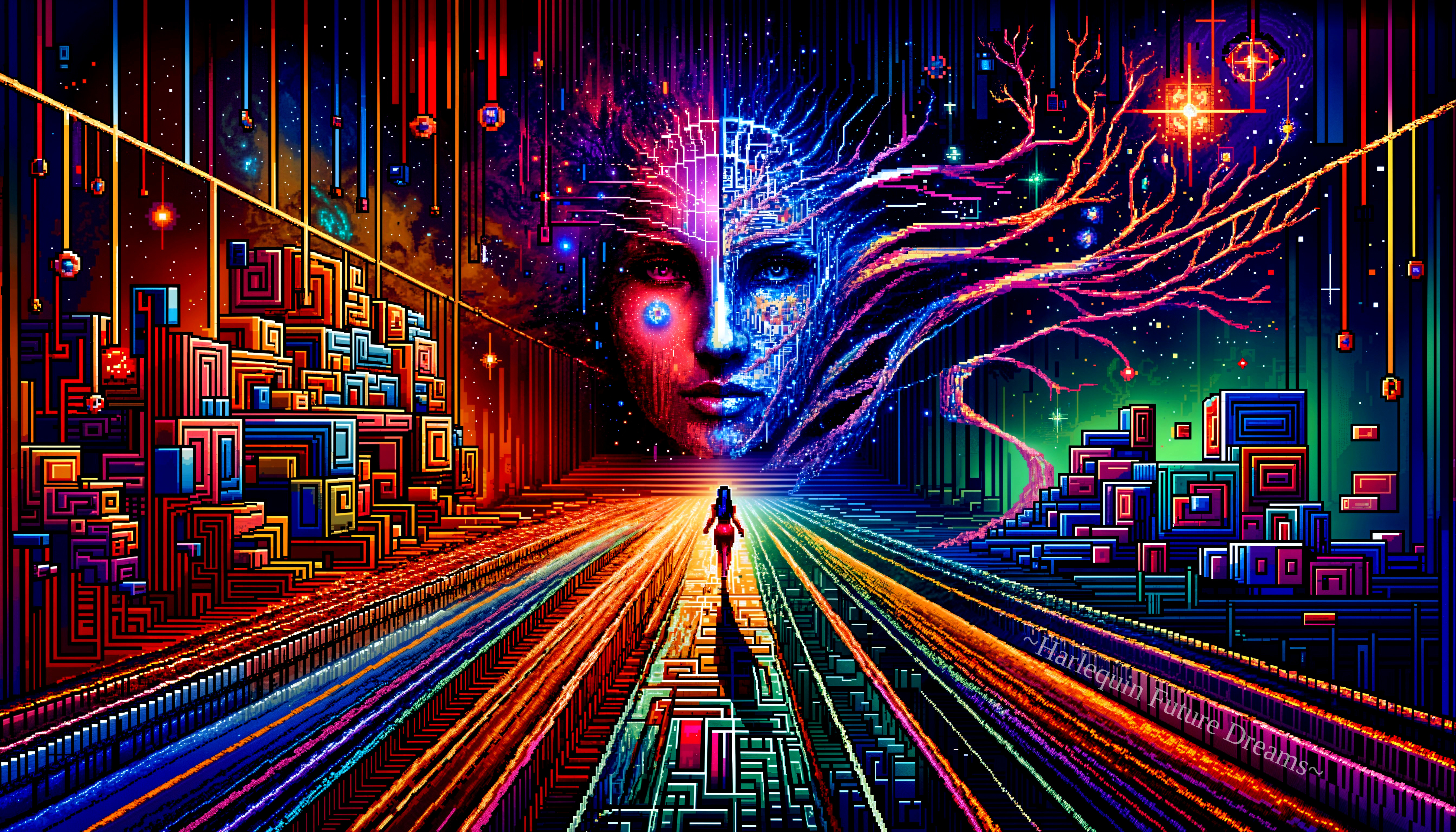 A vibrant, surreal landscape featuring a colorful, cosmic face intertwined with tree branches. A figure walks down a neon path, surrounded by abstract geometric shapes and stars.