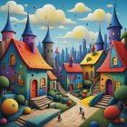 A whimsical landscape features colorful, geometric houses with vibrant roofs, surrounded by abstract trees and curving pathways under a serene sky filled with stylized clouds.