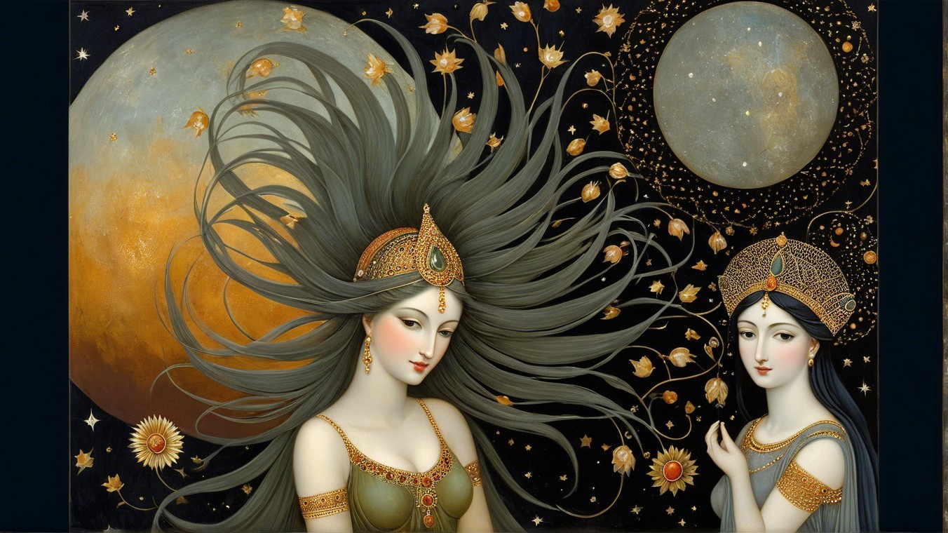 Nymph of the night is dark and full of beautiful magic. She had been born with a face that would let her get her way Big". In the style of Michael parkes. 3rd century Persian miniature art, golden ochre, sage green, pearl grey, paprika, blue-grey, Velvet Black, Shabby, Dull Gold, Amber Gray, Golden Ratio, Surreal Fantasy, Elegant, High Definition Ultra Fine 3D Line, Zenangle Style, Watercolor Patchwork , Arthur Rackham Style, Paul Kidby, , Jacek yerka, Extremely Detailed, Intricate, Thoughtful, HDR, Fractal, Beautiful, Award Winning, Fantasy Look, Fantasy, Crisp Quality