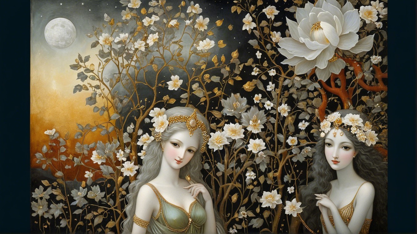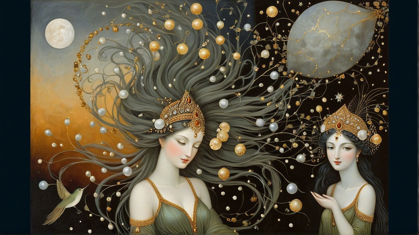 Nymph of the night is dark and full of beautiful magic. She had been born with a face that would let her get her way Big". 3rd century Persian miniature art, golden ochre, sage green, pearl grey, paprika, blue-grey, Velvet Black, Shabby, Dull Gold, Amber Gray, Golden Ratio, Surreal Fantasy, Elegant, High Definition Ultra Fine 3D Line, Zenangle Style, Watercolor Patchwork , Arthur Rackham Style, Paul Kidby, , Jacek yerka, Extremely Detailed, Intricate, Thoughtful, HDR, Fractal, Beautiful, Award Winning, Fantasy Look, Fantasy, Crisp Quality