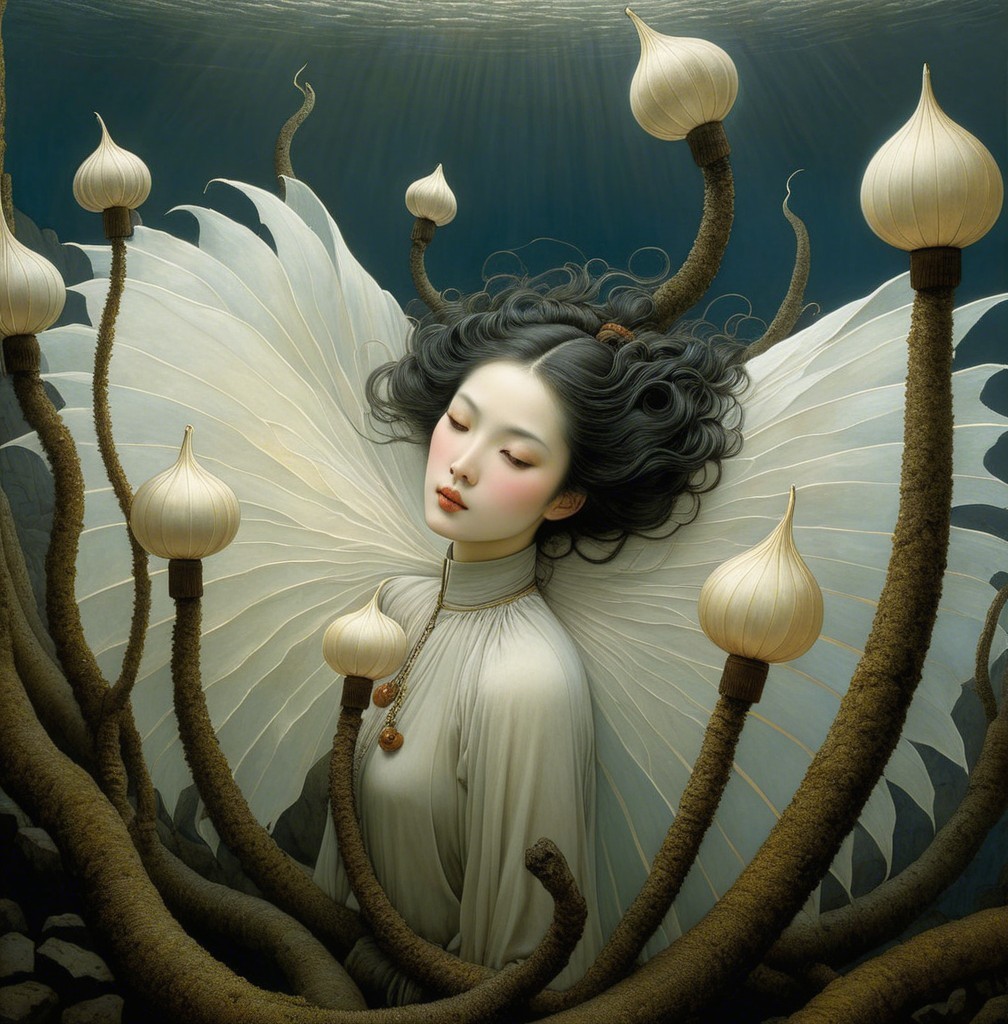 A serene figure with flowing dark hair and elegant attire, surrounded by ethereal wings and glowing lanterns, evokes a dreamlike ambiance, blending beauty and nature in a tranquil composition.
