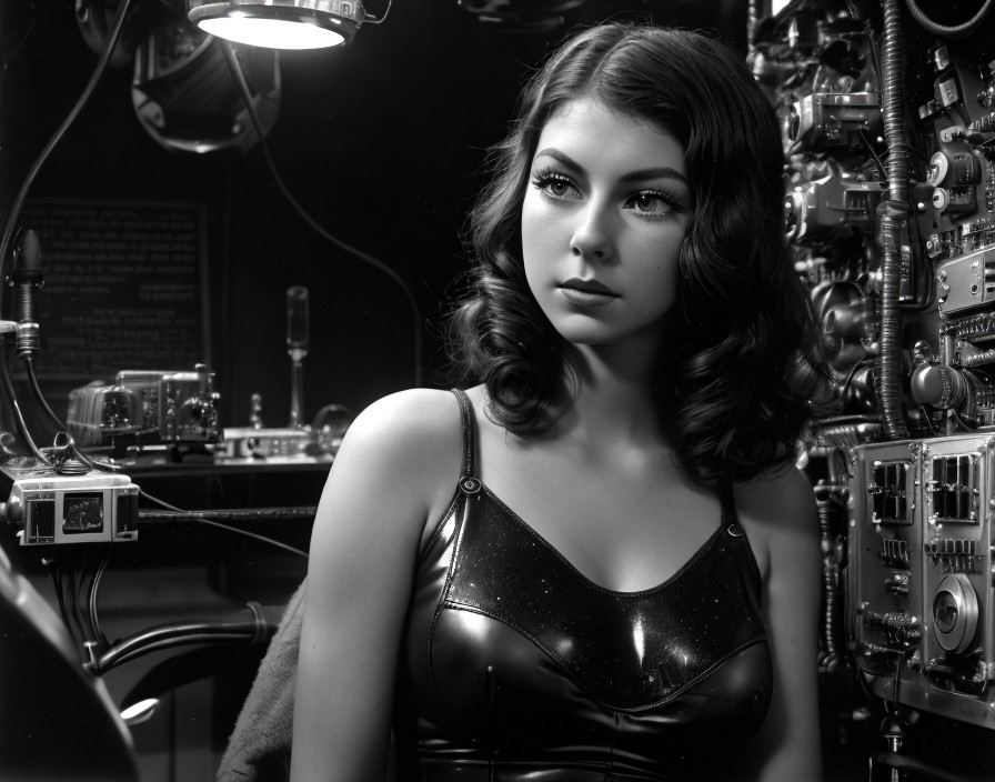Prompt: "A scene from a 1930 science fiction movie, black and white, daguerreotype, sci-fi, circuit boards, tubes,cables, dirt, an actress looking like Kira kosarin in a vintage space suite, sadness, melancholy"