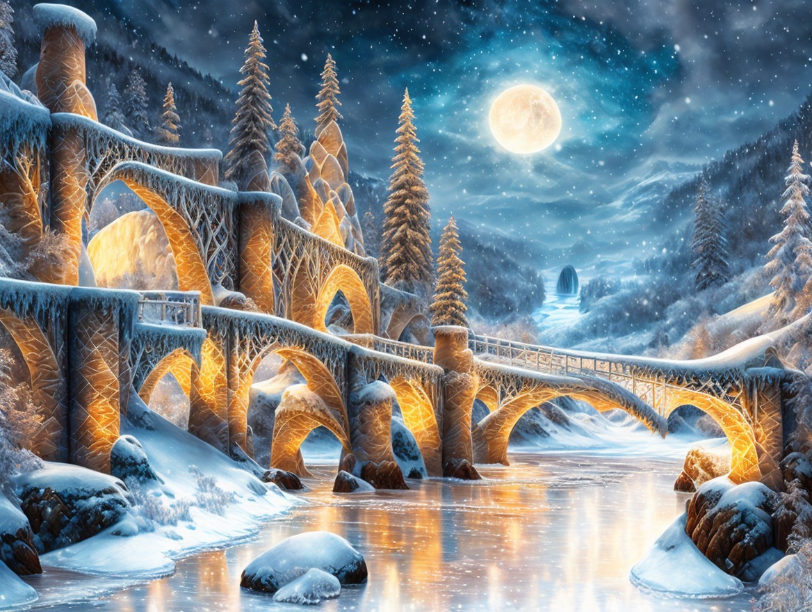 A surreal winter landscape at twilight, featuring a series of magnificent snow-covered stone bridges with intricate, vine-like carvings, glowing with warm orange luminescence from underneath. The bridges span across a partially frozen river or lake, where the ice reflects the golden light. Fluffy white snow covers the ground,