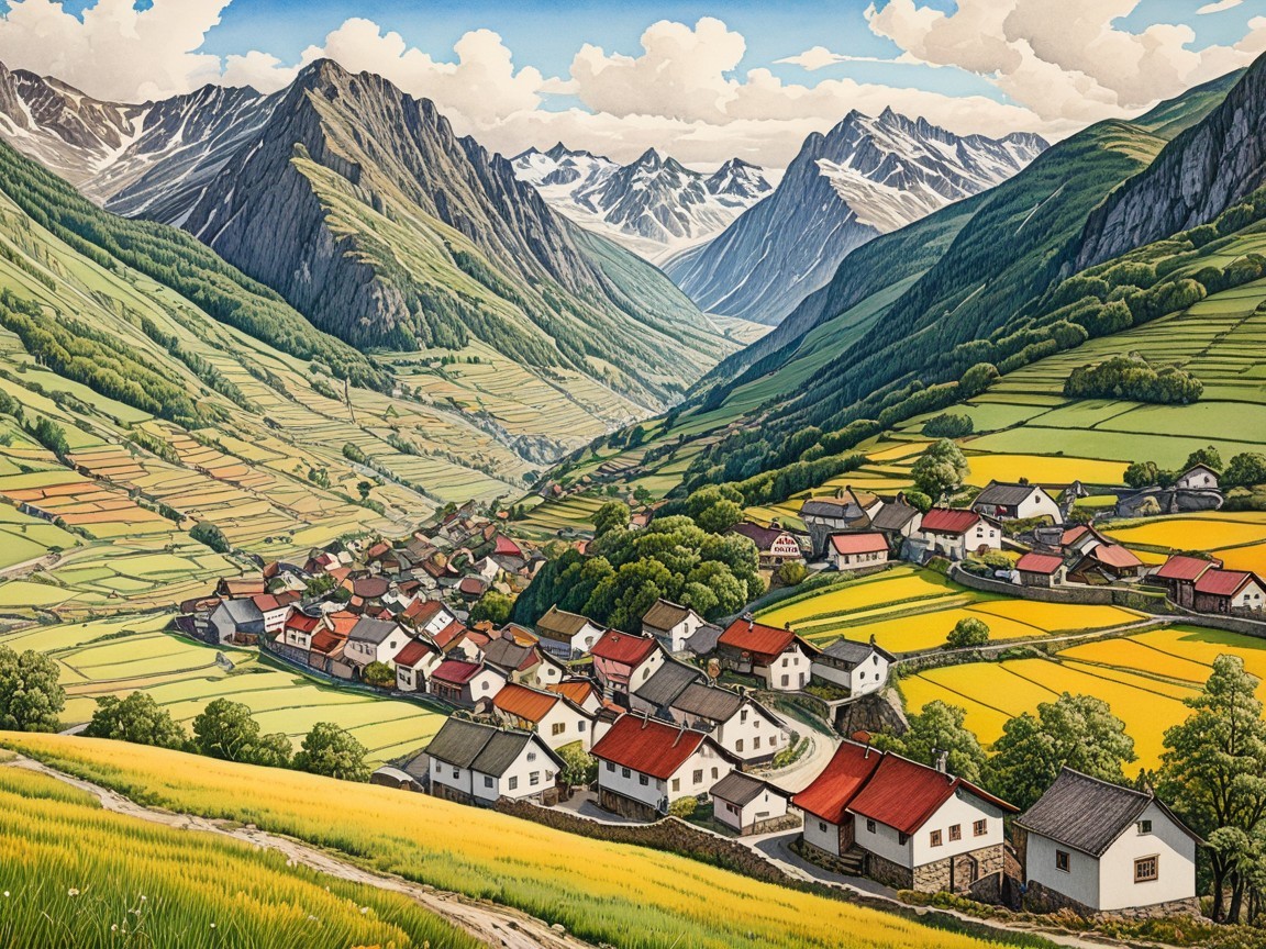 Prompt: Flock of black birds, many ravens, colored mountain valley with small old village, earh tones, extremely detailed lines, inspired by Otto Sinding