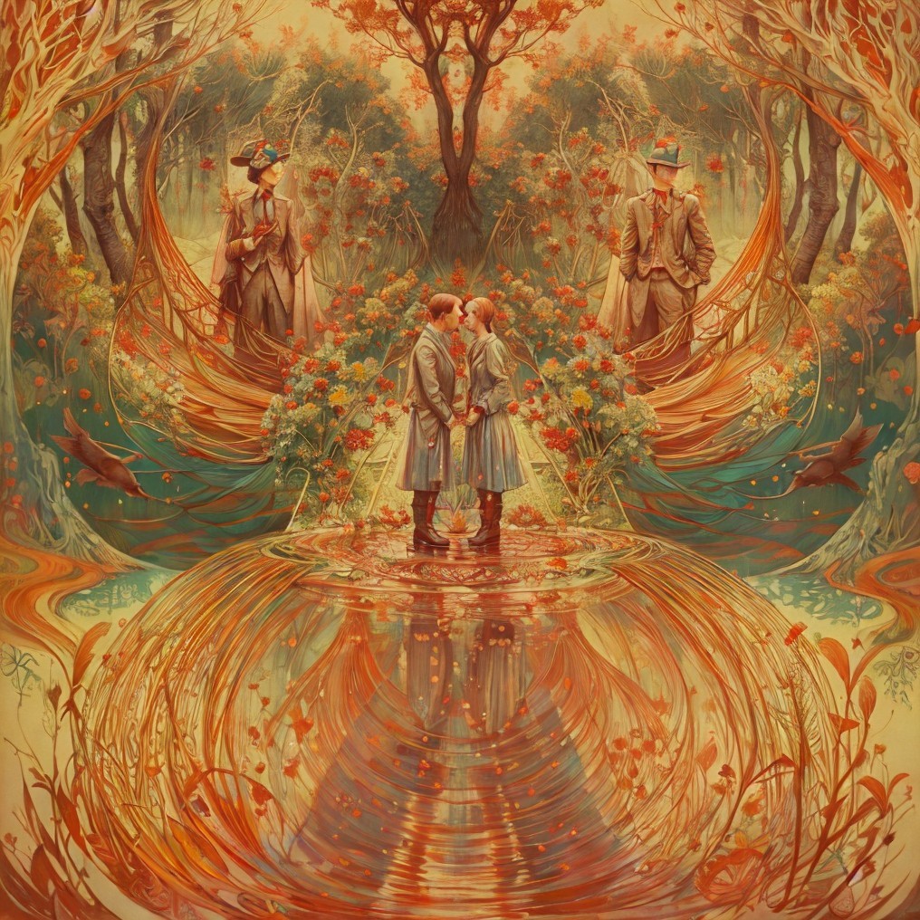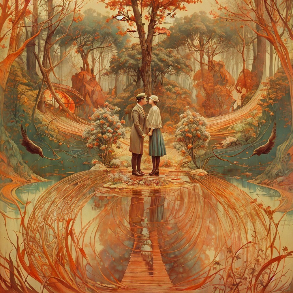 In a whimsical forest, a couple stands hand-in-hand by a serene, reflective stream. Lush trees and vibrant flowers surround them, creating a dreamlike atmosphere filled with gentle colors.