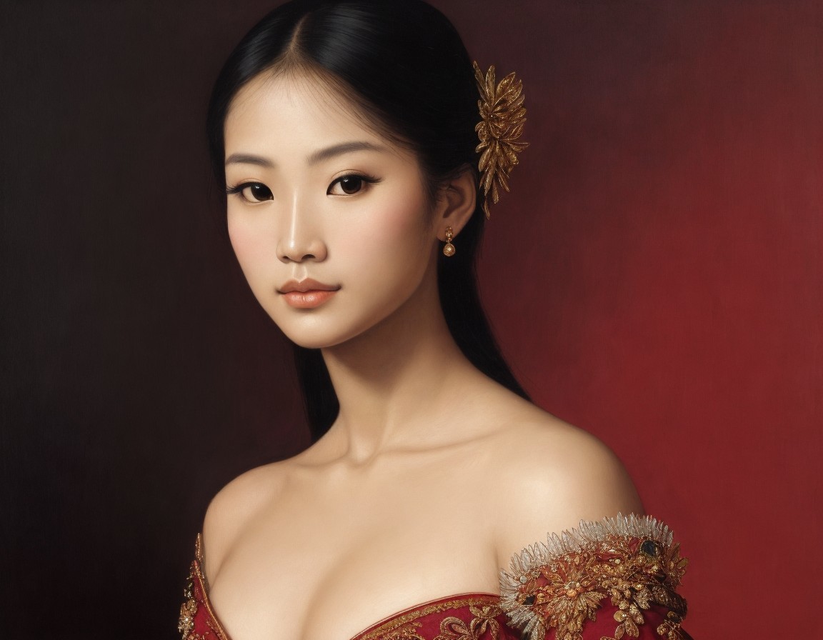 A woman in ornate gold attire with jewelry, poised elegantly against a luxurious backdrop.