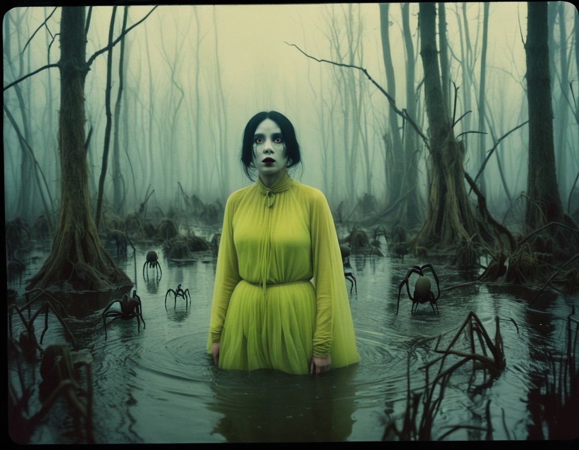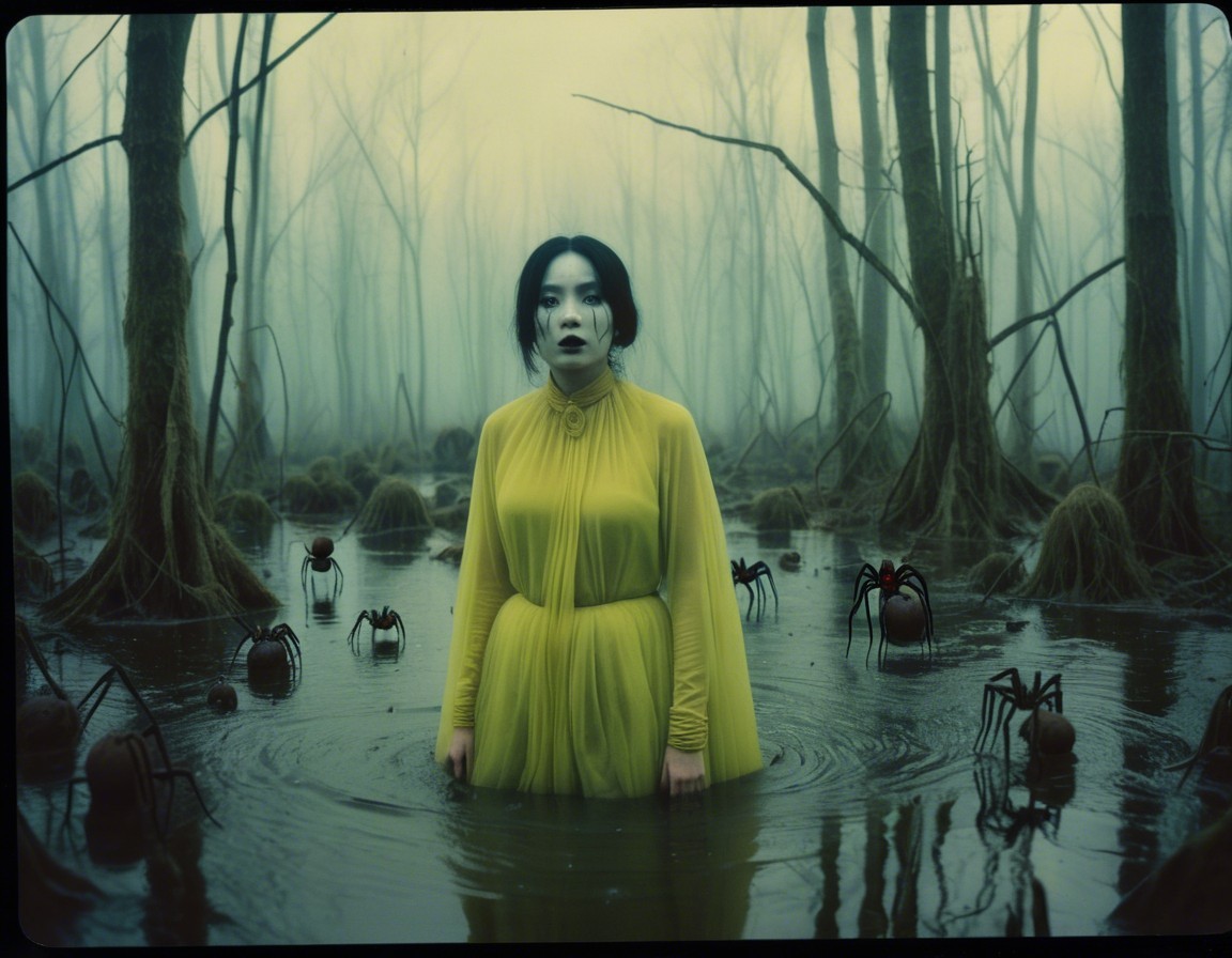 (Try from marek zarnovicky) - A figure in a flowing yellow dress stands mid-water in a misty, eerie forest, surrounded by ominous spiders. The atmosphere is haunting, blending beauty with an unsettling presence.