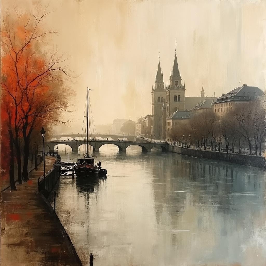 A serene riverscape featuring a bridge and sailboat, framed by trees with autumn hues. Tall spires rise above quaint buildings, all bathed in a soft, misty light, creating a dreamy atmosphere.