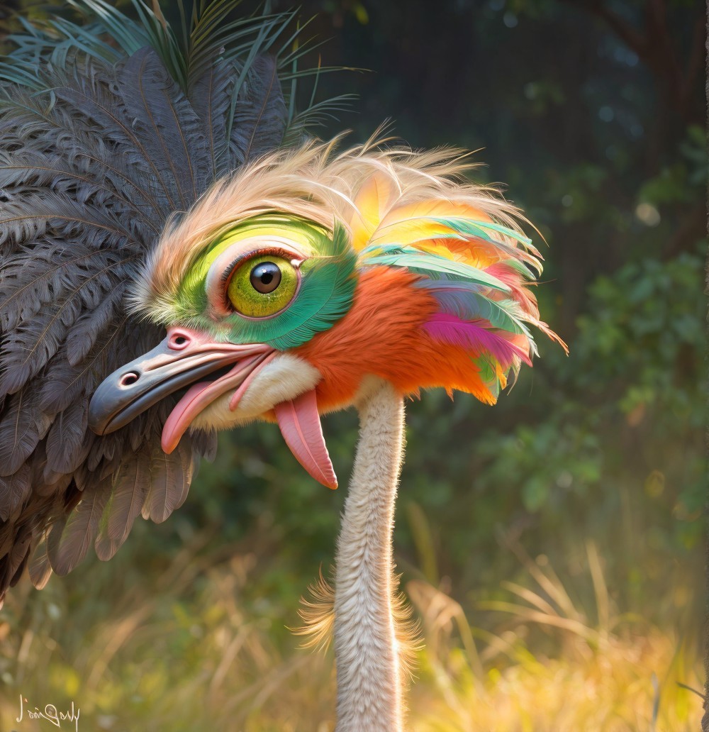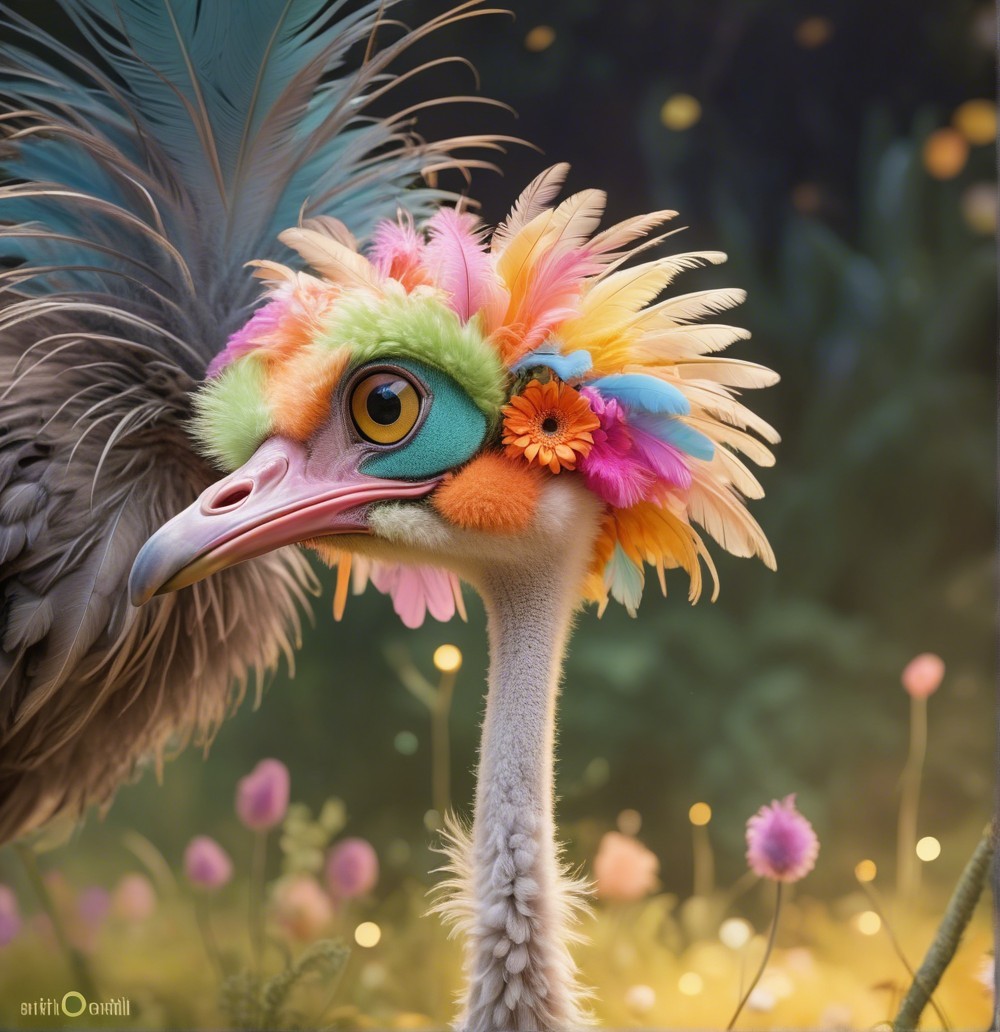 A whimsical bird with a colorful floral headdress, featuring vibrant petals and feathers, set against a dreamy, enchanting background filled with softly glowing lights and flowers.
