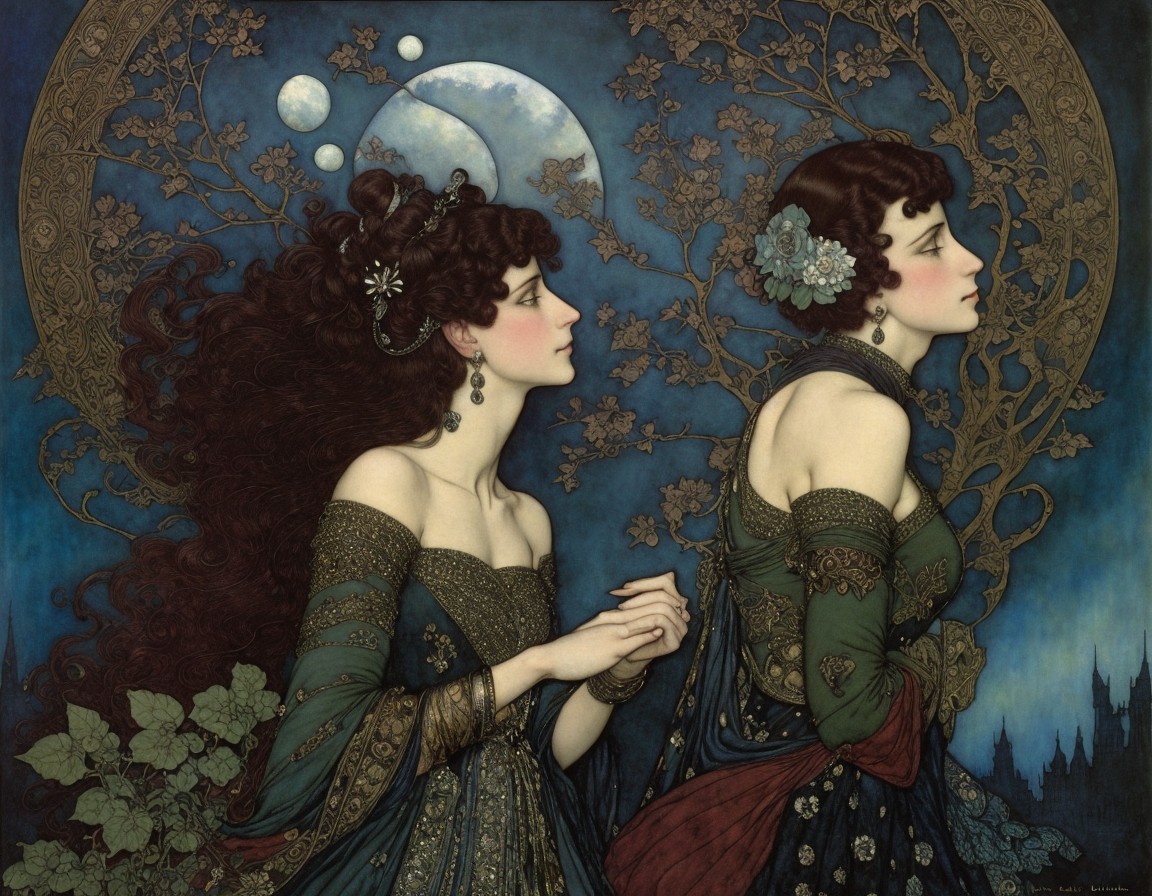The artwork features two elegant women draped in ornate, flowing garments against a deep blue background. One gazes thoughtfully, while the other adjusts her attire, framed by a luminous moon.