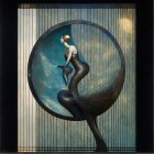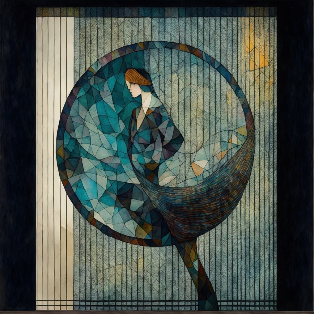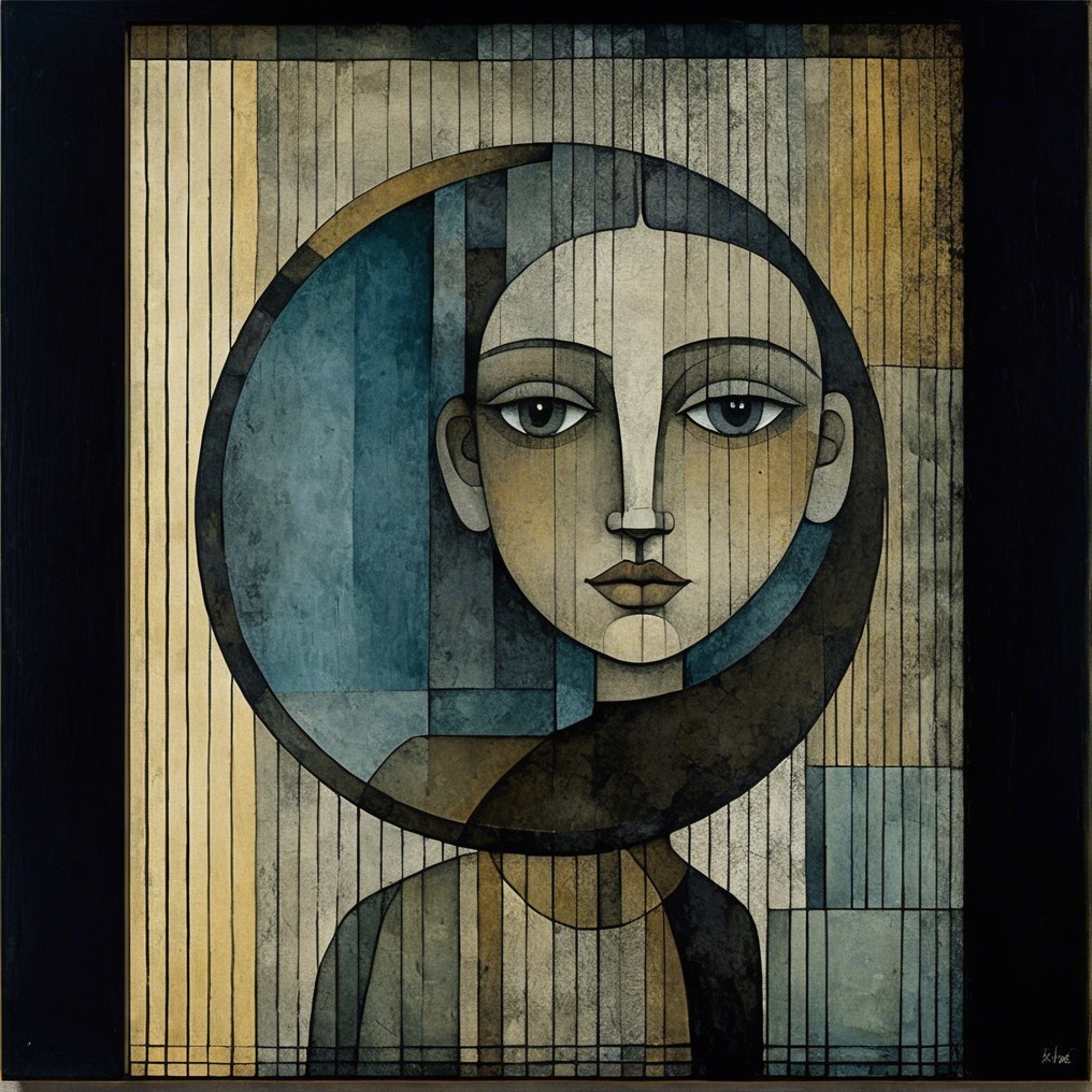 The image features a stylized portrait of a woman with a prominent round head and large, expressive eyes. Her expression is thoughtful, framed by muted colors and geometric lines.