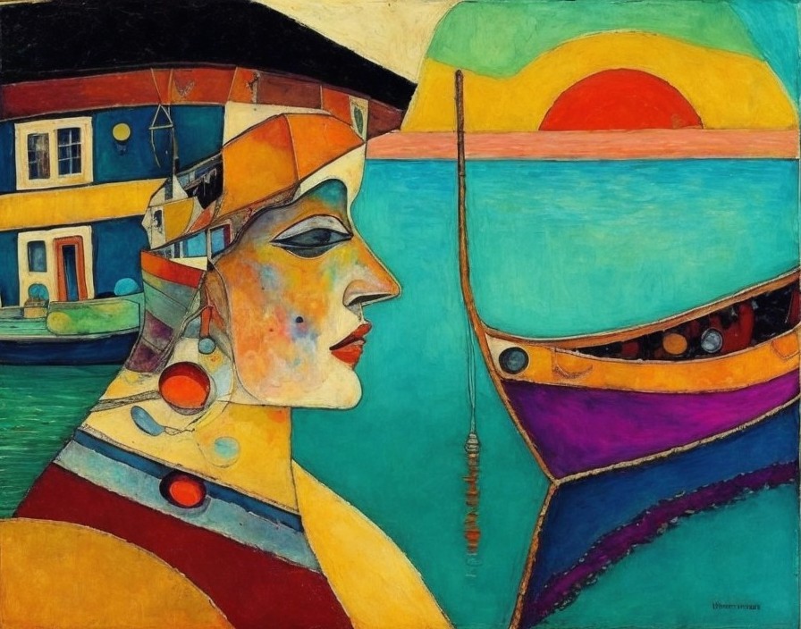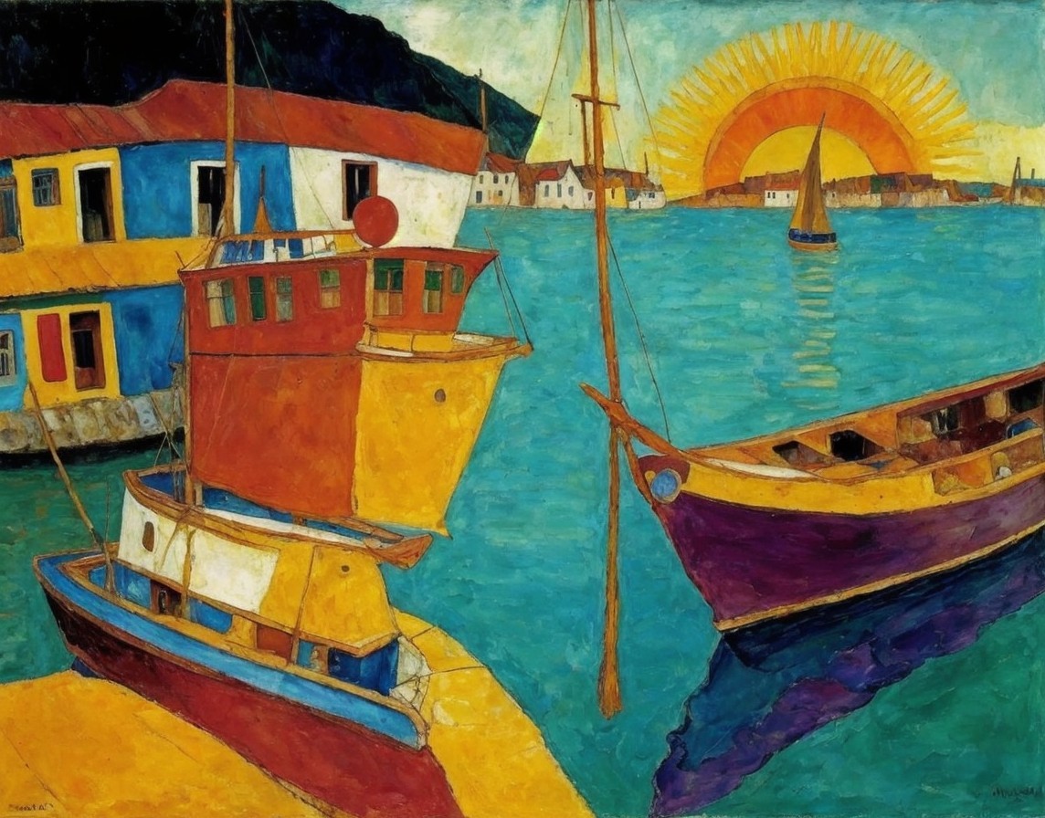 A vibrant painting depicting a coastal scene with colorful boats in the foreground and quaint houses against a large setting sun.