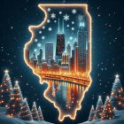 A glowing outline of Illinois features a winter scene of Chicago, with illuminated skyscrapers, a snowy sky, and decorated trees by a river, creating a festive, enchanting atmosphere.