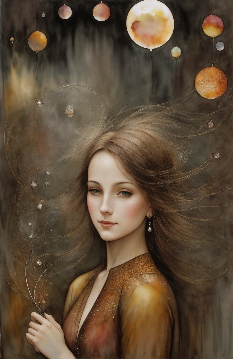 A woman with flowing hair gazes at luminescent bubbles against a dark backdrop, embodying a dreamy and elegant aura.