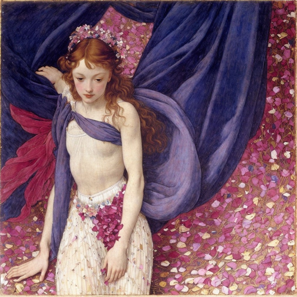 + Prompt:Ballerina in a flower petal skirt, skirt made of flower petals, pre-raphaelite, Botticelli, Klimt. Background in shades of ultramarine and fuchsia.