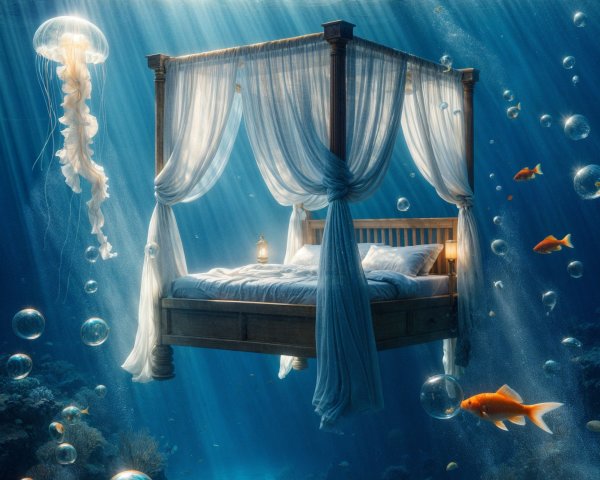 A whimsical underwater scene features a woman with flowing hair adorned with flowers, surrounded by vibrant goldfish and coral, creating a magical, ethereal atmosphere beneath shimmering light.